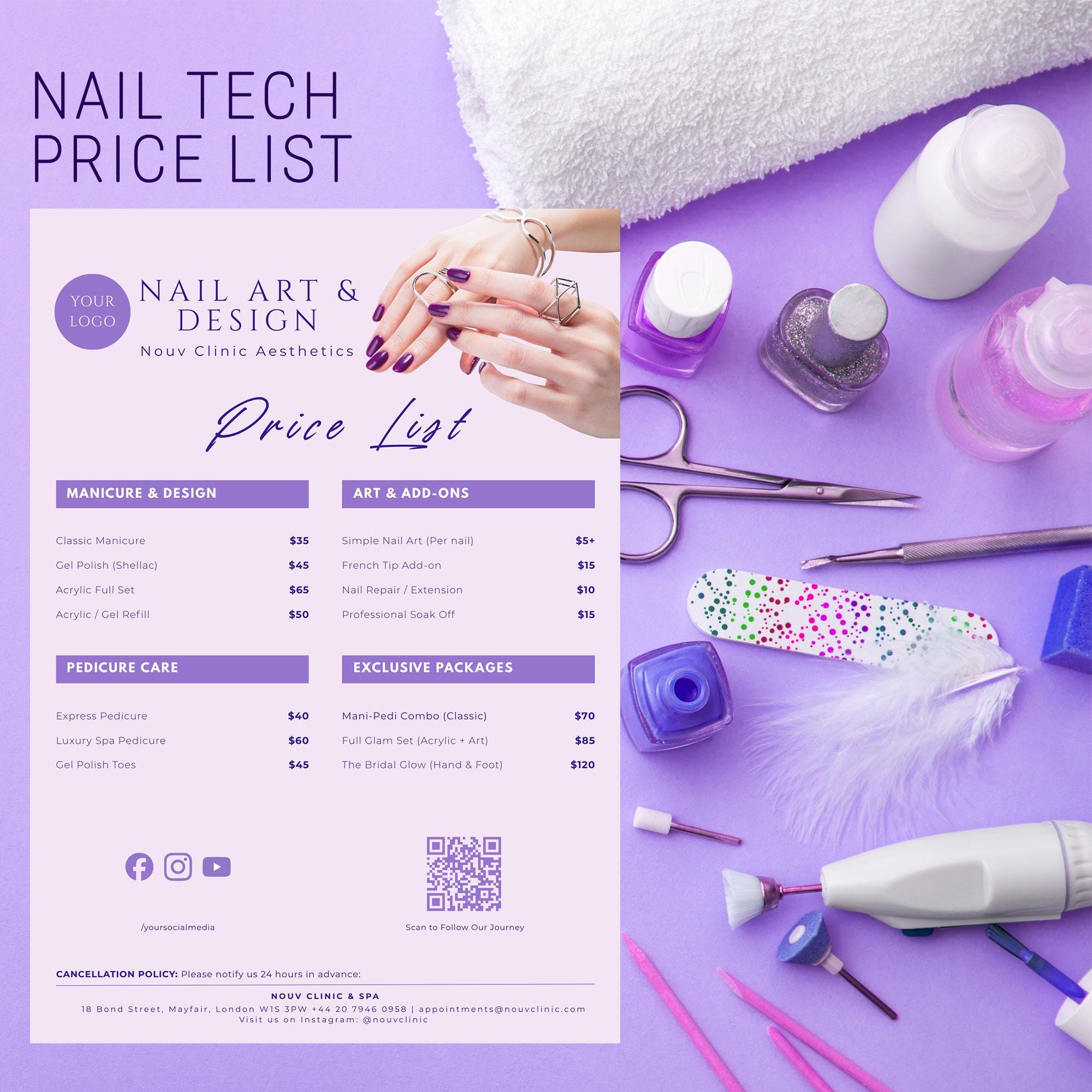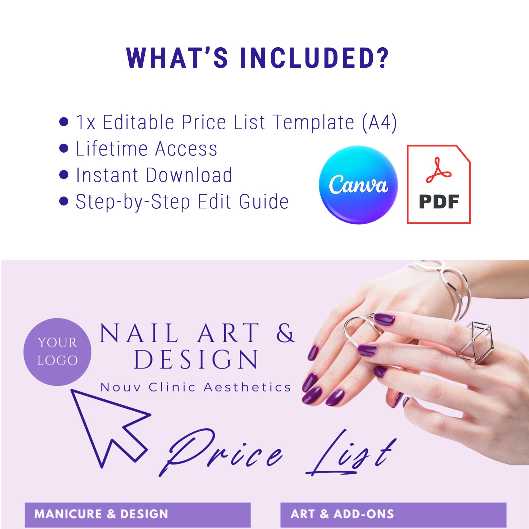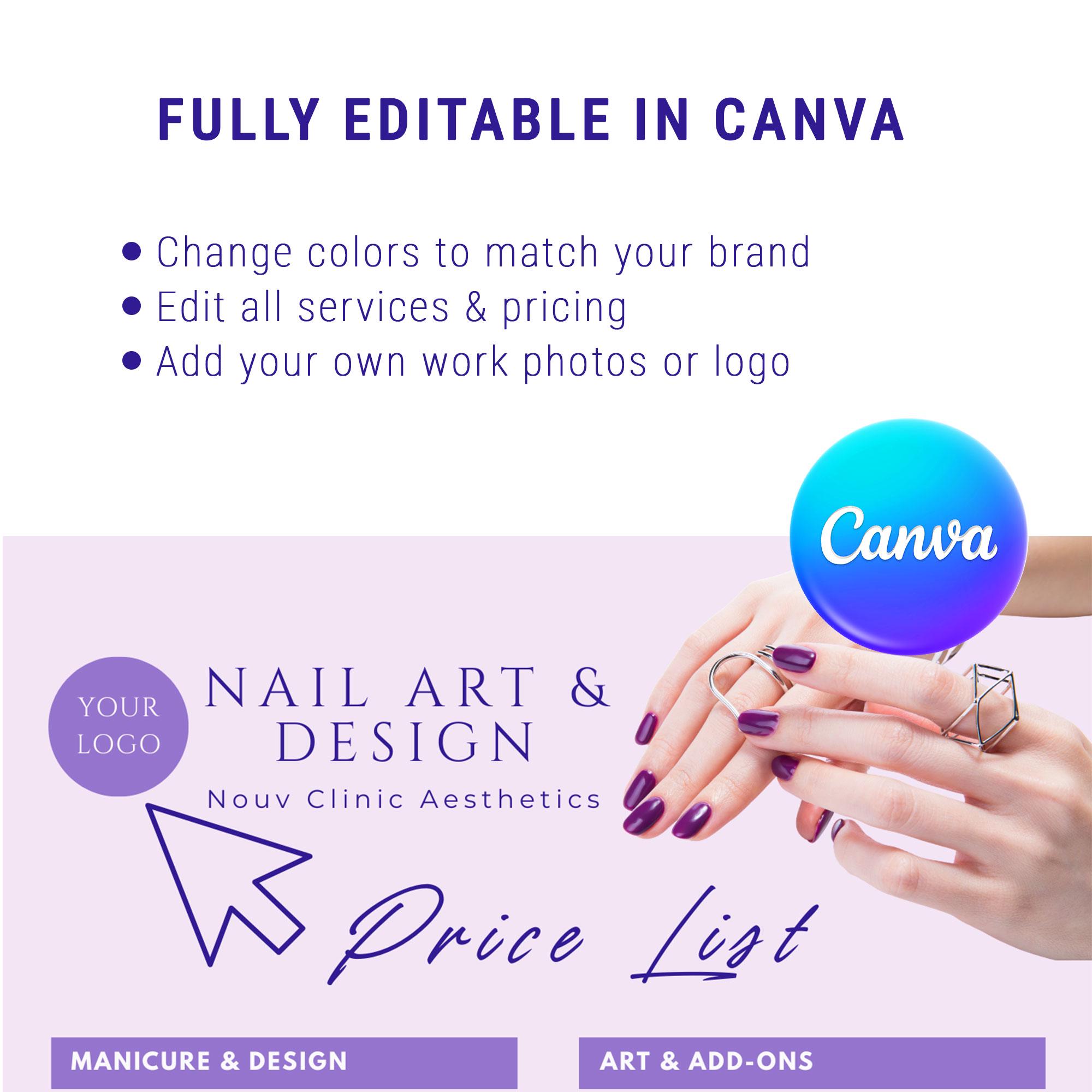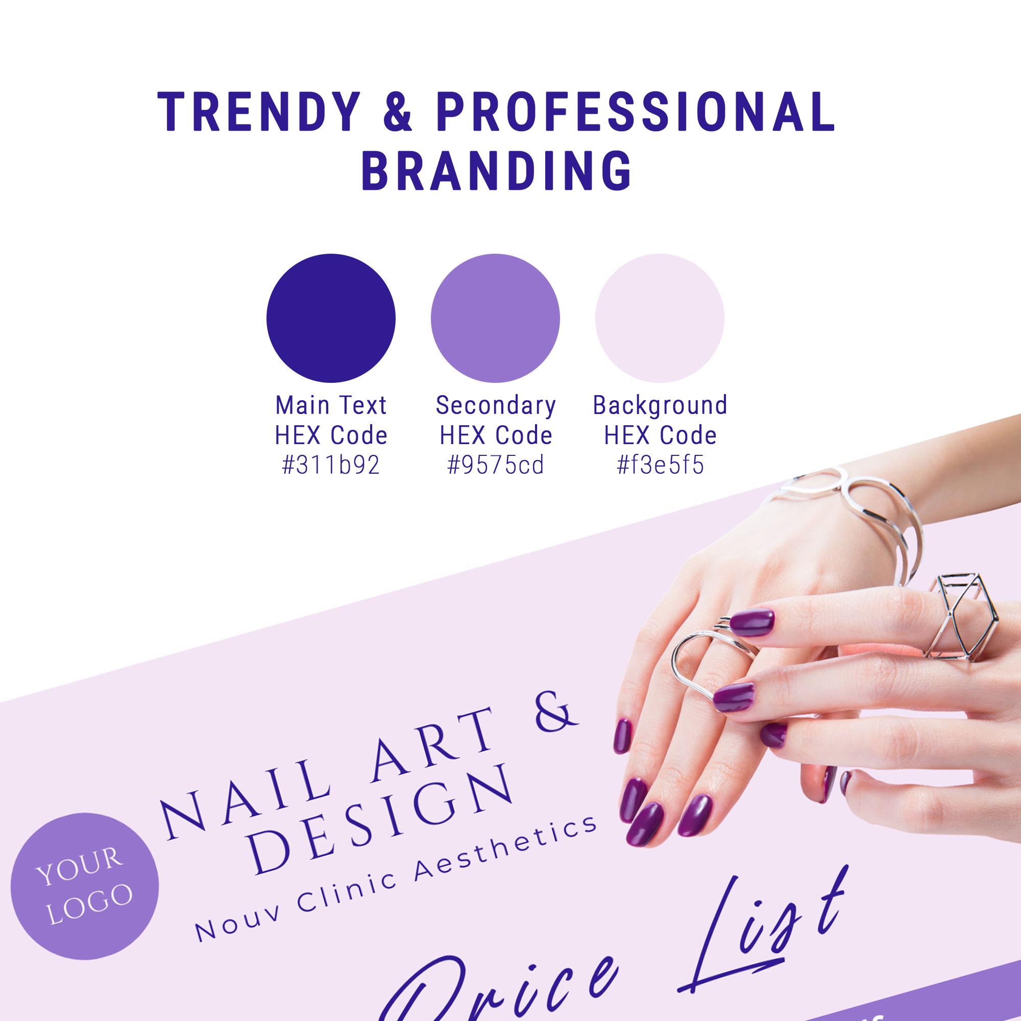 Looking for a chic and professional way to display your nail services? This Lavender-themed Price List template is perfect for modern nail technicians and salon owners. It’s 100% editable in Canva, meaning you can customize it to fit your unique brand in minutes!