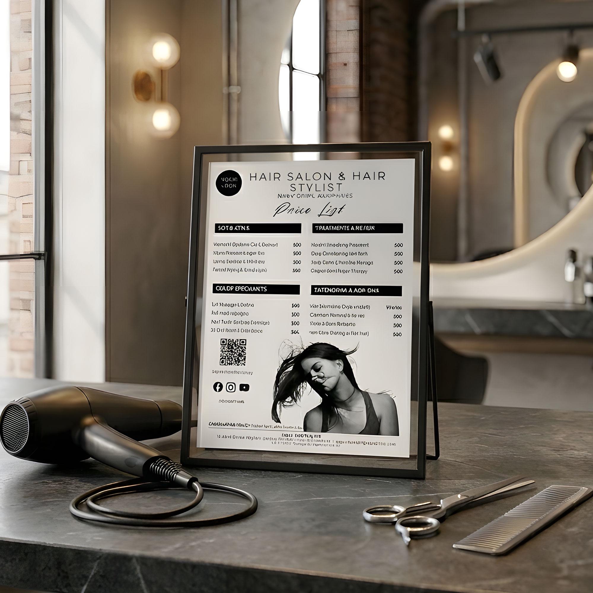 Minimalist Hair Salon Price List Template, Modern Stylist Service Menu (A4)