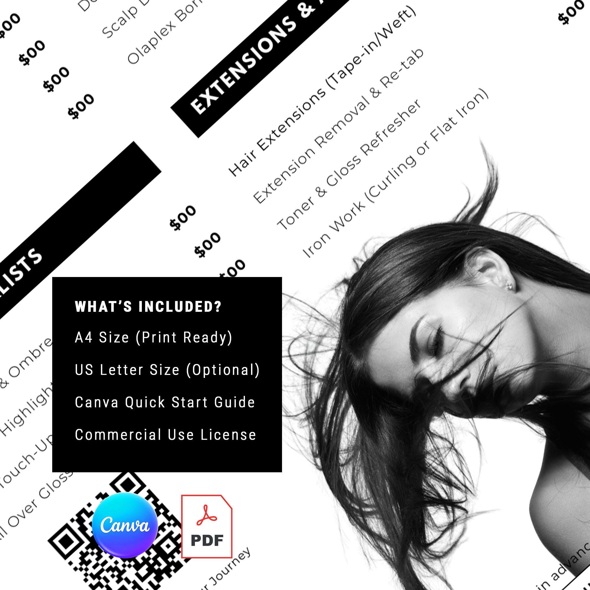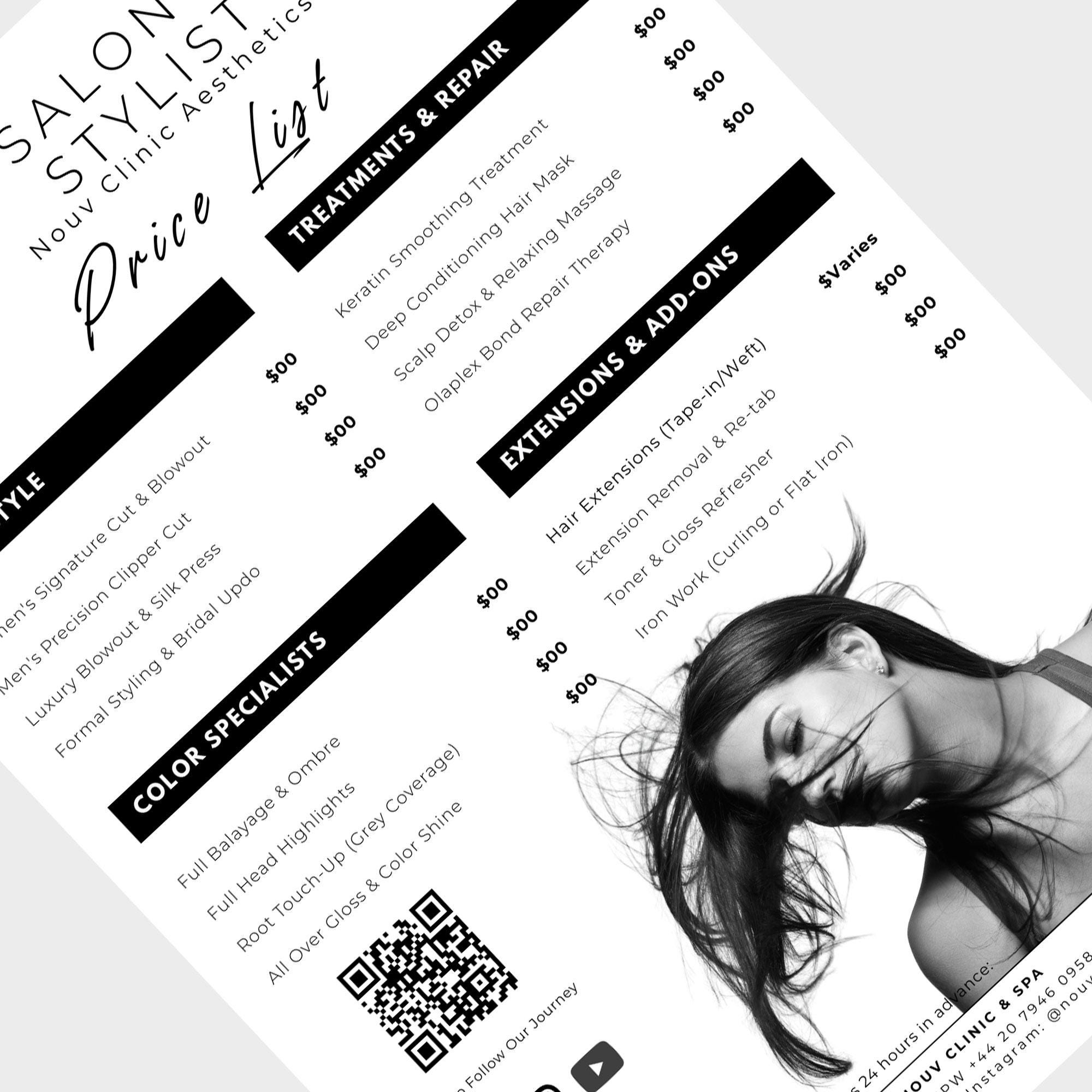 Elevate your salon’s branding with our Modern Monochrome Price List Template!