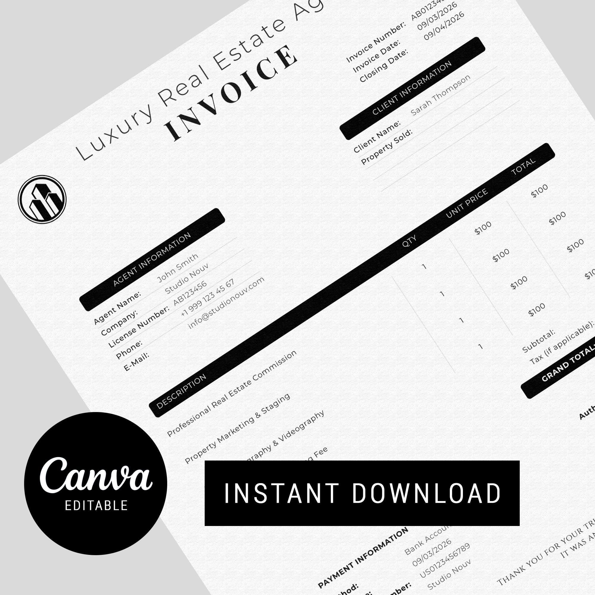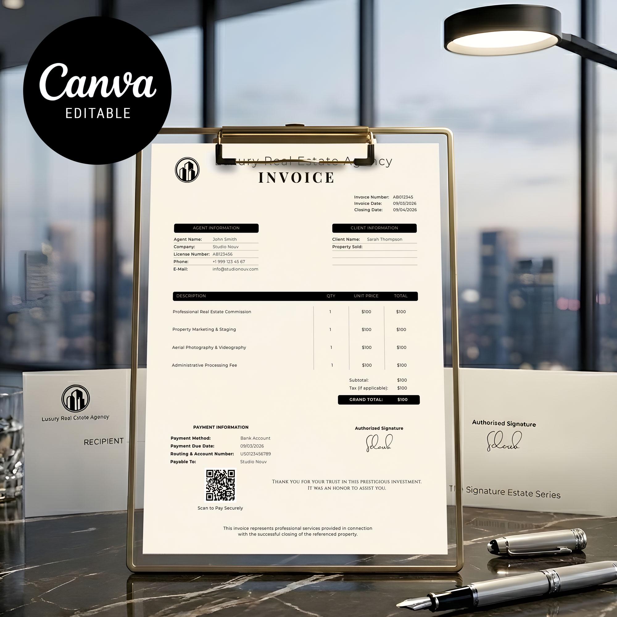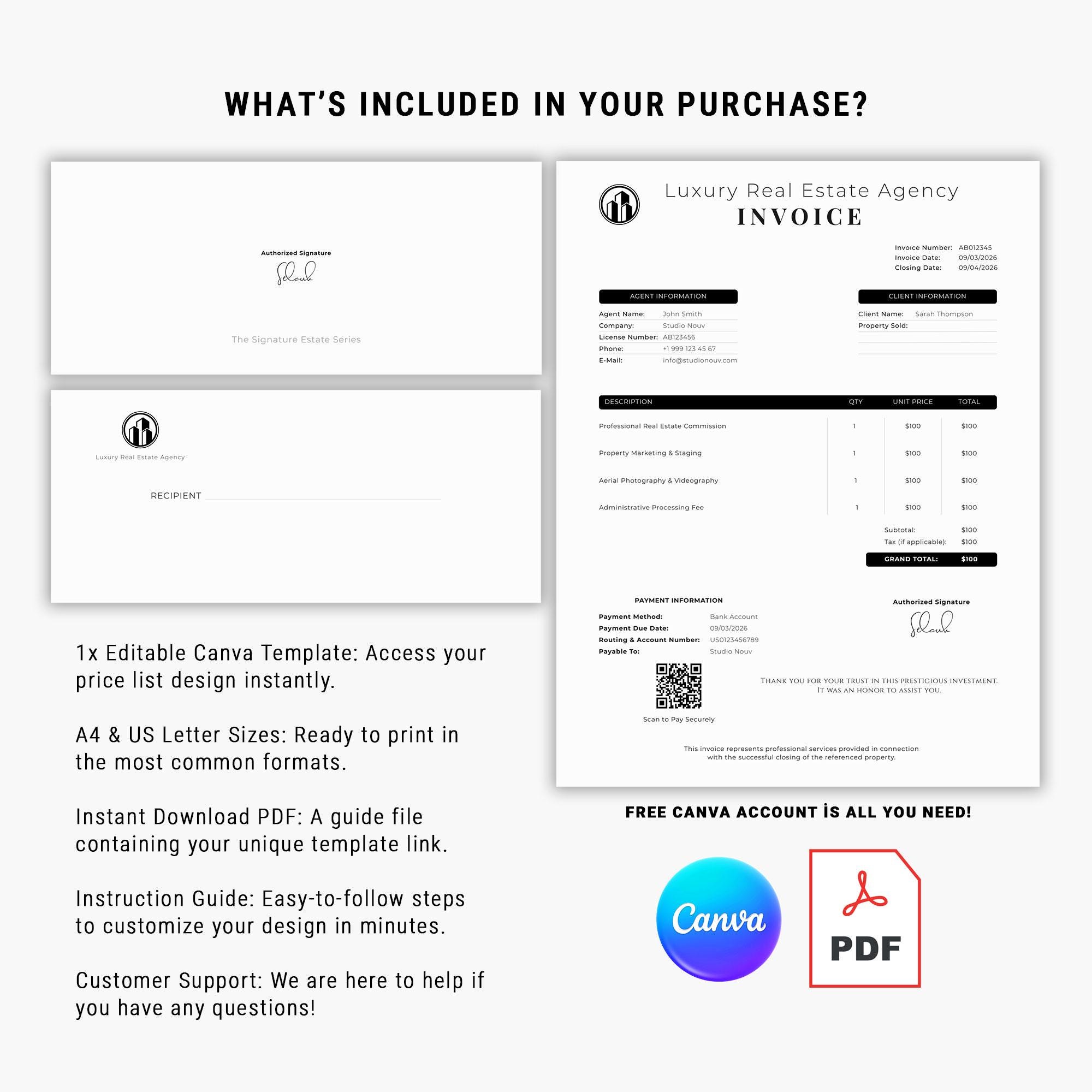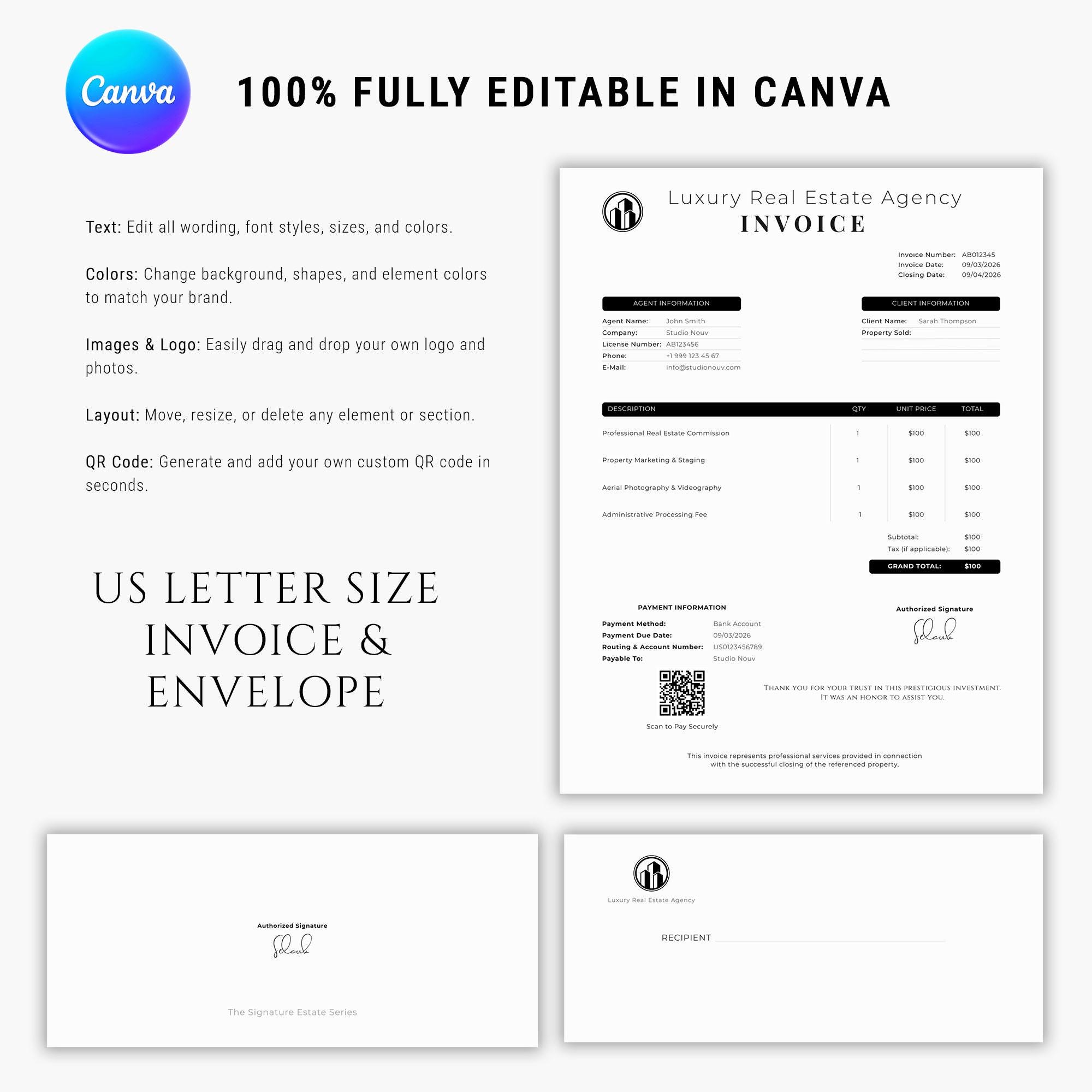 Luxury Real Estate Invoice & Envelope Bundle | Professional Realtor Commission Statement (Canva Template)